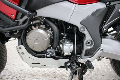 V4 shaftie is essentially the same powertrain as that of the VFR1200F but has been retuned to boost midrange and low down grunt (at the expense of top end) with new cam profiles to give reduced lift, longer inlet tracts and smaller diameter (by 10mm) exhausts. The result is a stupendously broad spread of sheer, smooth urge yet all flavoured with the charcateristically V4 rumbly drone. The slightest touch of throttle is enough to pull smoothly away and the progress thereafter completely linear and meaty yet enough, at the top end, to remind of true superbikes.