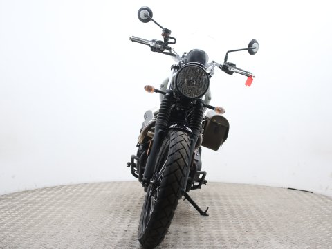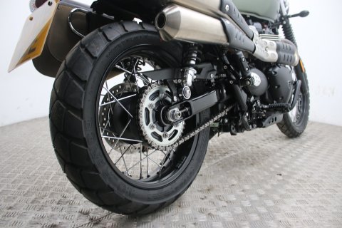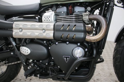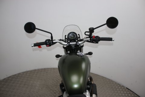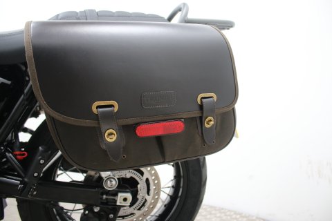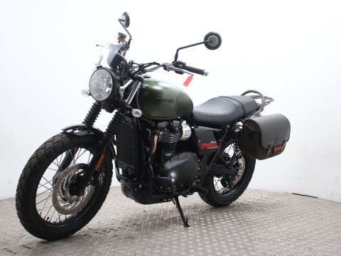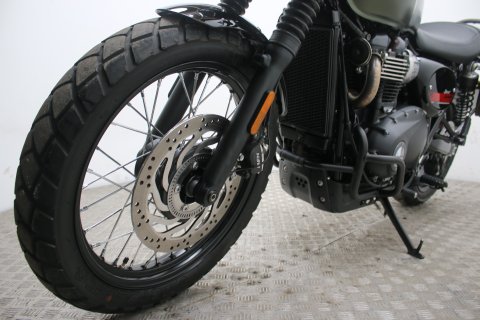 This particular Triumph Street Scrambler is in showroom-quality condition with exceptionally low mileage. It comes finished in the sought-after Matt Khaki Green and includes a practical "throw-over" pannier bag, adding to its rugged utility and classic aesthetic.